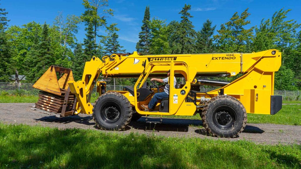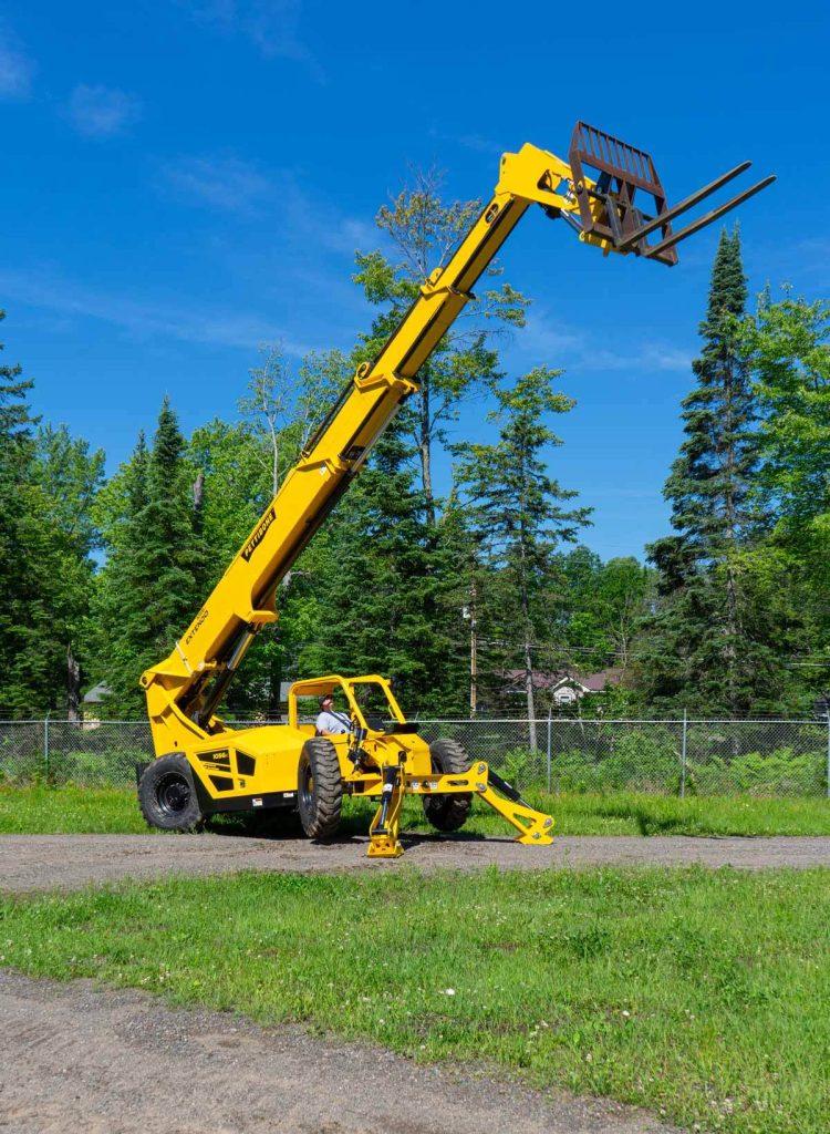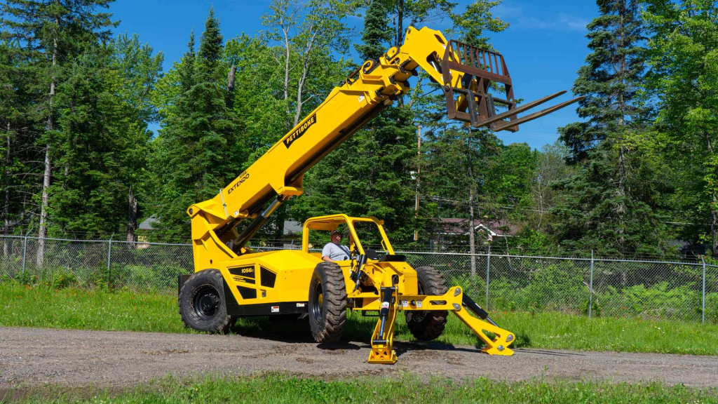 The powerful Extendo 1056X telehandler delivers 10,000 pounds max load capacity with a lift height of up to 56 feet, 6 inches. This versatile, heavy-duty telescopic handler easily navigates rough terrain with exceptional maneuverability.